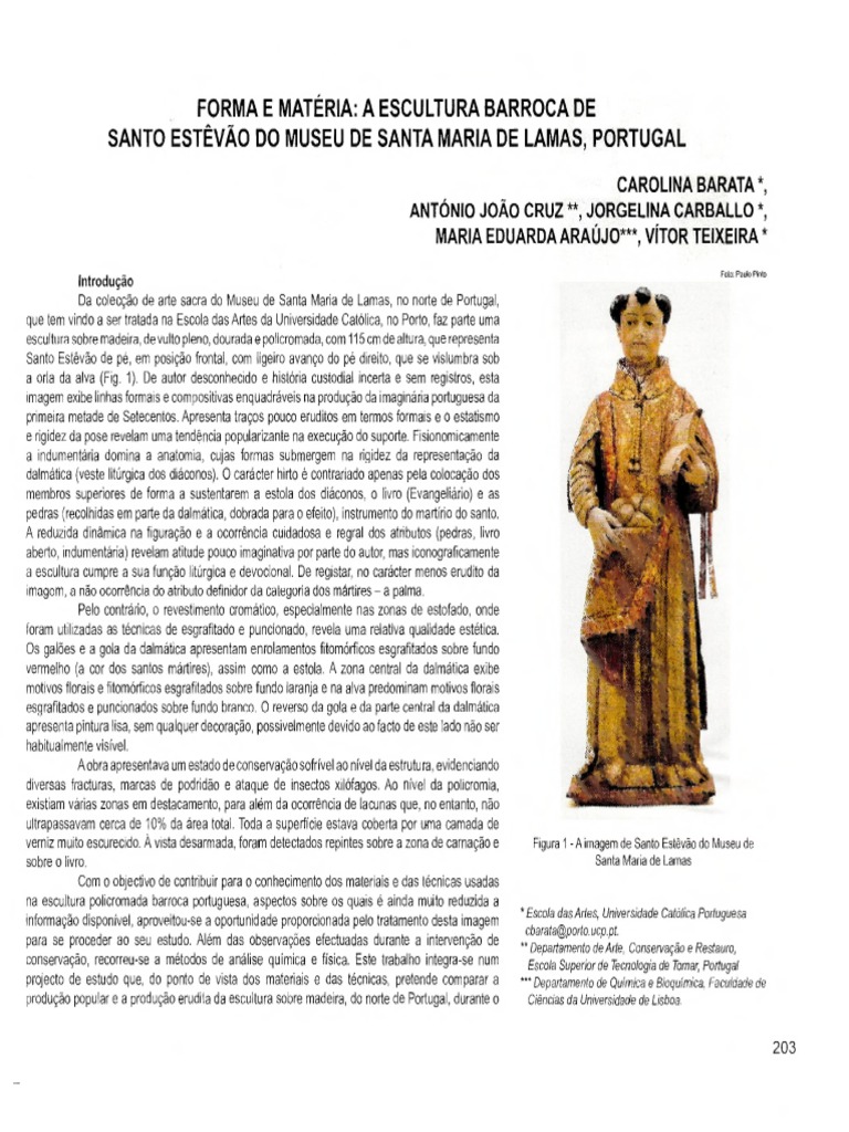 Da coleco de arte sacra do Museu de Santa Maria de Lamas, no norte de Portugal, que tem vindo a ser tratada na Escola das Artes da Universidade Catlica, no Porto, faz parte uma escultura sobre madeira, de vulto pleno, dourada e policromada, com 115 cm de altura, que representa Santo Estvo de p, em posio frontal, com ligeiro avano do p direito, que se vislumbra sob a orla da alva (Fig. 1). De autor desconhecido e histria custodiai incerta e sem registros, esta imagem exibe linhas formais e compositivas enquadrveis na produo da imaginria portuguesa da primeira metade de Setecentos. Apresenta traos pouco eruditos em termos formais e o estatismo e rigidez da pose revelam uma tendncia popularizante na execuo do suporte. Fisionomicamente a indumentria domina a anatomia, cujas formas submergem na rigidez da representao da dalmtica (veste litrgica dos diconos). O carcter hirto contrariado apenas pela colocao dos membros superiores de forma a sustentarem a estola dos diconos, o livro (Evangelirio) e as pedras (recolhidas em parte da dalmtica, dobrada para o efeito), instrumento do martrio do santo. A reduzida dinmica na figurao e a ocorrncia cuidadosa e regral dos atributos (pedras, livro aberto, indumentria) revelam atitude pouco imaginativa por parte do autor, mas iconograficamente a escultura cumpre a sua funo litrgica e devocional. De registar, no carcter menos erudito da imagem, a no ocorrncia do atributo definidor da categoria dos mrtires a palma. Pelo contrrio, o revestimento cromtico, especialmente nas zonas de estofado, onde foram utilizadas as tcnicas de esgrafitado e puncionado, revela uma relativa qualidade esttica. Os gales e a gola da dalmtica apresentam enrolamentos fitomrficos esgrafitados sobre fundo vermelho (a cor dos santos mrtires), assim como a estola. A zona central da dalmtica exibe motivos florais e fitomrficos esgrafitados sobre fundo laranja e na alva predominam motivos florais esgrafitados e puncionados sobre fundo branco. O reverso da gola e da parte central da dalmtica apresenta pintura lisa, sem qualquer decorao, possivelmente devido ao facto de este lado no ser habitualmente visvel. A obra apresentava um estado de conservao sofrvel ao nvel da estrutura, evidenciando diversas fracturas, marcas de podrido e ataque de insectos xilfagos. Ao nvel da policromia, existiam vrias zonas em destacamento, para alm da ocorrncia de lacunas que, no entanto, no ultrapassavam cerca de 10% da rea total. Toda a superfcie estava coberta por uma camada de verniz muito escurecido. vista desarmada, foram detectados repintes sobre a zona de carnao e sobre o livro. Com o objectivo de contribuir para o conhecimento dos materiais e das tcnicas usadas na escultura policromada barroca portuguesa, aspectos sobre os quais ainda muito reduzida a informao disponvel, aproveitou-se a oportunidade proporcionada pelo tratamento desta imagem para se proceder ao seu estudo. Alm das observaes efectuadas durante a interveno de conservao, recorreu-se a mtodos de anlise qumica e fsica. Este trabalho integra-se num projecto de estudo que, do ponto de vista dos materiais e das tcnicas, pretende comparar a produo popular e a produo erudita da escultura sobre madeira, do norte de Portugal, durante o