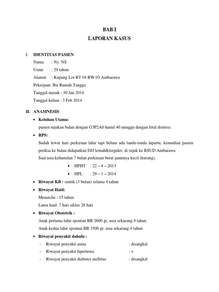Pekerjaan: Ibu Rumah Tangga Tanggal masuk : 30 Jan 2014 Tanggal keluar : 3 Feb 2014 II. ANAMNESIS Keluhan Utama: pasien rujukan bidan dengan G3P2A0 hamil 40 minggu dengan fetal distress. RPS: Sudah lewat hari perkiraan lahir tapi belum ada tanda-tanda inpartu, kemudian pasien periksa ke bidan didapatkan DJJ lemah&ireguler, di rujuk ke RSUD Ambarawa Saat usia kehamilan 7 bulan perkiraan berat janinnya kecil (kurang). Riwayat Haid: Menarche : 15 tahun Lama haid: 7 hari siklus 28 hari Riwayat Obstetrik : Anak pertama lahir spontan BB 2600 gr, usia sekarang 9 tahun Anak kedua lahir spontan BB 3500 gr, usia sekarang 4 tahun Riwayat penyakit dahulu : Riwayat penyakit asma Riwayat penyakit hipertensi Riwayat penyakit diabetes mellitus : disangkal :+ : disangkal HPHT HPL : 22 4 2013 : 29 1 2014