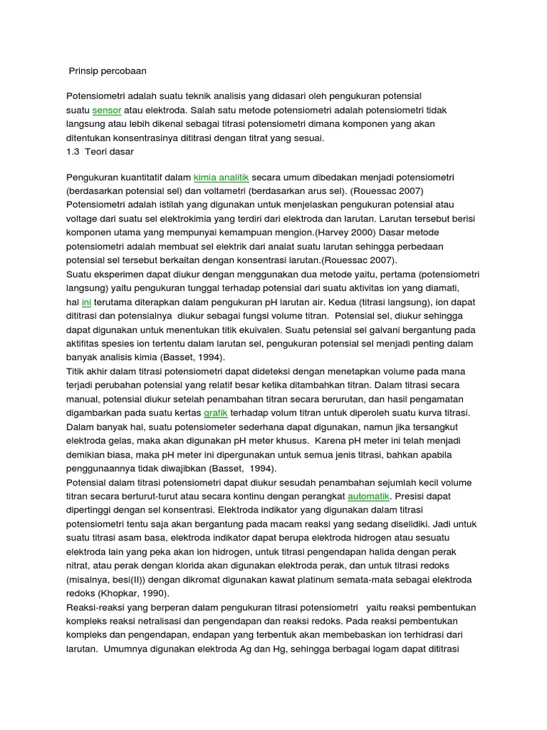 elektroda. Salah satu metode potensiometri adalah potensiometri tidak langsung atau lebih dikenal sebagai titrasi potensiometri dimana komponen yang akan ditentukan konsentrasinya dititrasi dengan titrat yang sesuai. 1.3 Teori dasar Pengukuran kuantitatif dalam kimia analitik secara umum dibedakan menjadi potensiometri (berdasarkan potensial sel) dan voltametri (berdasarkan arus sel). (Rouessac 2007) Potensiometri adalah istilah yang digunakan untuk menjelaskan pengukuran potensial atau voltage dari suatu sel elektrokimia yang terdiri dari elektroda dan larutan. Larutan tersebut berisi komponen utama yang mempunyai kemampuan mengion.(Harvey 2000) Dasar metode potensiometri adalah membuat sel elektrik dari analat suatu larutan sehingga perbedaan potensial sel tersebut berkaitan dengan konsentrasi larutan.(Rouessac 2007). Suatu eksperimen dapat diukur dengan menggunakan dua metode yaitu, pertama (potensiometri langsung) yaitu pengukuran tunggal terhadap potensial dari suatu aktivitas ion yang diamati, hal ini terutama diterapkan dalam pengukuran pH larutan air. Kedua (titrasi langsung), ion dapat dititrasi dan potensialnya diukur sebagai fungsi volume titran. Potensial sel, diukur sehingga dapat digunakan untuk menentukan titik ekuivalen. Suatu petensial sel galvani bergantung pada aktifitas spesies ion tertentu dalam larutan sel, pengukuran potensial sel menjadi penting dalam banyak analisis kimia (Basset, 1994). Titik akhir dalam titrasi potensiometri dapat dideteksi dengan menetapkan volume pada mana terjadi perubahan potensial yang relatif besar ketika ditambahkan titran. Dalam titrasi secara manual, potensial diukur setelah penambahan titran secara berurutan, dan hasil pengamatan digambarkan pada suatu kertas grafik terhadap volum titran untuk diperoleh suatu kurva titrasi. Dalam banyak hal, suatu potensiometer sederhana dapat digunakan, namun jika tersangkut elektroda gelas, maka akan digunakan pH meter khusus. Karena pH meter ini telah menjadi demikian biasa, maka pH meter ini dipergunakan untuk semua jenis titrasi, bahkan apabila penggunaannya tidak diwajibkan (Basset, 1994). Potensial dalam titrasi potensiometri dapat diukur sesudah penambahan sejumlah kecil volume titran secara berturut-turut atau secara kontinu dengan perangkat automatik. Presisi dapat dipertinggi dengan sel konsentrasi. Elektroda indikator yang digunakan dalam titrasi potensiometri tentu saja akan bergantung pada macam reaksi yang sedang diselidiki. Jadi untuk suatu titrasi asam basa, elektroda indikator dapat berupa elektroda hidrogen atau sesuatu elektroda lain yang peka akan ion hidrogen, untuk titrasi pengendapan halida dengan perak nitrat, atau perak dengan klorida akan digunakan elektroda perak, dan untuk titrasi redoks (misalnya, besi(II)) dengan dikromat digunakan kawat platinum semata-mata sebagai elektroda redoks (Khopkar, 1990). Reaksi-reaksi yang berperan dalam pengukuran titrasi potensiometri yaitu reaksi pembentukan kompleks reaksi netralisasi dan pengendapan dan reaksi redoks. Pada reaksi pembentukan kompleks dan pengendapan, endapan yang terbentuk akan membebaskan ion terhidrasi dari larutan. Umumnya digunakan elektroda Ag dan Hg, sehingga berbagai logam dapat dititrasi