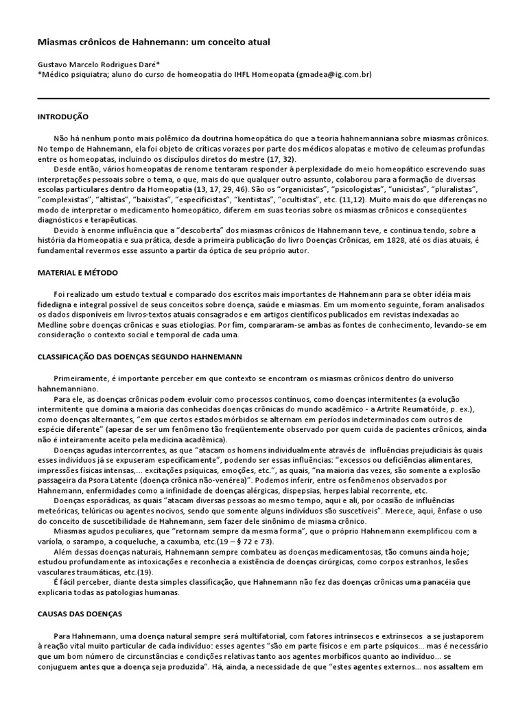 INTRODUO No h nenhum ponto mais polmico da doutrina homeoptica do que a teoria hahnemanniana sobre miasmas crnicos. No tempo de Hahnemann, ela foi objeto de crticas vorazes por parte dos mdicos alopatas e motivo de celeumas profundas entre os homeopatas, incluindo os discpulos diretos do mestre (17, 32). Desde ento, vrios homeopatas de renome tentaram responder perplexidade do meio homeoptico escrevendo suas interpretaes pessoais sobre o tema, o que, mais do que qualquer outro assunto, colaborou para a formao de diversas escolas particulares dentro da Homeopatia (13, 17, 29, 46). So os organicistas, psicologistas, unicistas, pluralistas, complexistas, altistas, baixistas, especificistas, kentistas, ocultistas, et c. (11,12). Muito mais do que diferenas no modo de interpretar o medicamento homeoptico, diferem em suas teorias sobre os miasmas crnicos e conseqentes diagnsticos e teraputicas. Devido enorme influncia que a descoberta dos miasmas crn icos de Hahnemann teve, e continua tendo, sobre a histria da Homeopatia e sua prtica, desde a primeira publicao do livro Doenas Crnicas, em 1828, at os dias atuais, fundamental revermos esse assunto a partir da ptica de seu prprio autor. MATERIAL E MTODO Foi realizado um estudo textual e comparado dos escritos mais importantes de Hahnemann para se obter idia mais fidedigna e integral possvel de seus conceitos sobre doena, sade e miasmas. Em um momento seguinte, foram analisados os dados disponveis em livros-textos atuais consagrados e em artigos cientficos publicados em revistas indexadas ao Medline sobre doenas crnicas e suas etiologias. Por fim, compararam-se ambas as fontes de conhecimento, levando-se em considerao o contexto social e temporal de cada uma. CLASSIFICAO DAS DOENAS SEGUNDO HAHNEMANN Primeiramente, importante perceber em que contexto se encontram os miasmas crnicos dentro do universo hahnemanniano. Para ele, as doenas crnicas podem evoluir como processos contnuos, como doenas intermitentes (a evoluo intermitente que domina a maioria das conhecidas doenas crnicas do mundo acadmico - a Artrite Reumatide, p. ex.), como doenas alternantes, em que certos estados mrbidos se alternam em perodos indeterminados com outros de espcie diferente (apesar de ser um fenmeno to freqentemente observado por quem cuida de pacientes crnicos, ainda no inteiramente aceito pela medicina acadmica). Doenas agudas intercorrentes, as que atacam os homens individualmente atravs de influncias prejudiciais s quais esses indivduos j se expuseram especificamente, podendo ser essas influncias: excessos ou deficincias alimentares, impresses fsicas intensas,... excitaes psquicas, emoes, etc., as quais, na maioria das vezes, so somente a exploso passageira da Psora Latente (doena crnica no-venrea). Podemos inferir, entre os fenmenos observados por Hahnemann, enfermidades como a infinidade de doenas alrgicas, dispepsias, herpes labial recorrente, etc. Doenas espordicas, as quais atacam diversas pessoas ao mesmo tempo, aqui e ali, por ocasio de influncias metericas, telricas ou agentes nocivos, sendo que somente alguns indivduos so suscetveis. Mere ce, aqui, nfase o uso do conceito de suscetibilidade de Hahnemann, sem fazer dele sinnimo de miasma crnico. Miasmas agudos peculiares, que retornam sempre da mesma forma, que o prprio Hahnemann exemplificou com a varola, o sarampo, a coqueluche, a caxumba, etc.(19 72 e 73). Alm dessas doenas naturais, Hahnemann sempre combateu as doenas medicamentosas, to comuns ainda hoje; estudou profundamente as intoxicaes e reconhecia a existncia de doenas cirrgicas, como corpos estranhos, leses vasculares traumticas, etc.(19). fcil perceber, diante desta simples classificao, que Hahnemann no fez das doenas crnicas uma panacia que explicaria todas as patologias humanas. CAUSAS DAS DOENAS Para Hahnemann, uma doena natural sempre ser multifatorial, com fatores intrnsecos e extrnsecos a se justaporem reao vital muito particular de cada indivduo: esses agentes so em parte fsicos e em parte psquicos... mas necessr io que um bom nmero de circunstncias e condies relativas tanto aos agentes morbficos quanto ao indivduo... se conjuguem antes que a doena seja produzida. H, ainda, a necessidade de que estes agentes externos... nos assaltem em