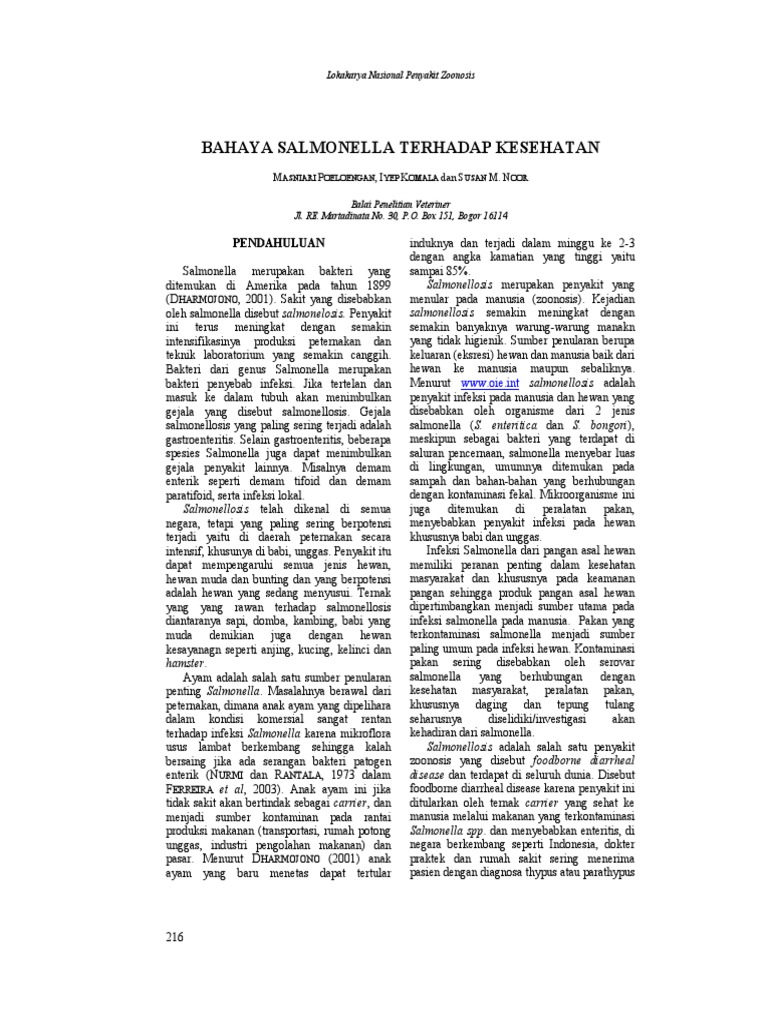 DAFTAR PUSTAKA BOPP, C., 2003. Manual for the Laboratory Identification and Antimicrobial Testing of Bacterial Pathogens of Public Health Importance in the Developing World. USAIDWHO-CDC, Atlanta. CHUNG, Y.H., S.Y. KIM, and Y.H. CHANG, 2003. Prevalence and Antibiotic Susceptibility of Salmonella Isolated from Foods in Korea from 1993 to 2001. J. Food Prot. Vol. 66:11541157. COX, J., 2000. Salmonella (Introduction). Dalam Encyclopedia of Food Microbiology, Vol. 3. ROBINSON, R.K., C.A. BATT and P.D. PATEL (Editors). Academic Press, San Diego. DE VRIES, T.S., 2003. Salmonella Control in the netherlands Leading to Reduction. World Poultry, vol. 19:26-28. DHARMOJONO. 2001. Limabelas Penyakit Menular dari Binatang ke Manusia. Milenia Populer, Jakarta. DIREKTORAT BINA KESEHATAN HEWAN, 1982. Pedoman Pengendalian Penyakit Hewan Menular. Jilid I-V. Direktorat Bina Kesehatan Hewan, Direktorat Jenderal Peternakan, Departemen Pertanian, Jakarta.