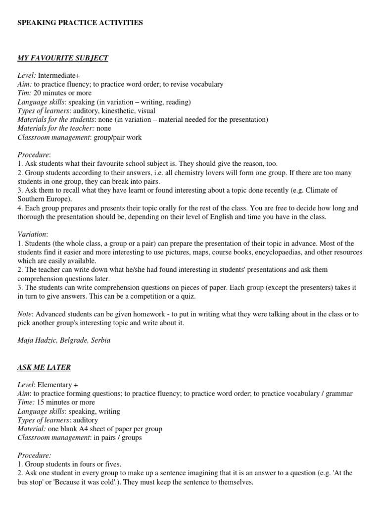 MY FAVOURITE SUBJECT Level: Intermediate+ Aim: to practice fluency; to practice word order; to revise vocabulary Tim: 20 minutes or more Language skills: speaking (in variation writing, reading) Types of learners: auditory, kinesthetic, visual Materials for the students: none (in variation material needed for the presentation) Materials for the teacher: none Classroom management: group/pair work Procedure: 1. Ask students what their favourite school subject is. They should give the reason, too. 2. Group students according to their answers, i.e. all chemistry lovers will form one group. If there are too many students in one group, they can break into pairs. 3. Ask them to recall what they have learnt or found interesting about a topic done recently (e.g. Climate of Southern Europe). 4. Each group prepares and presents their topic orally for the rest of the class. You are free to decide how long and thorough the presentation should be, depending on their level of English and time you have in the class. Variation: 1. Students (the whole class, a group or a pair) can prepare the presentation of their topic in advance. Most of the students find it easier and more interesting to use pictures, maps, course books, encyclopaedias, and other resources which are easily available. 2. The teacher can write down what he/she had found interesting in students' presentations and ask them comprehension questions later. 3. The students can write comprehension questions on pieces of paper. Each group (except the presenters) takes it in turn to give answers. This can be a competition or a quiz. Note: Advanced students can be given homework - to put in writing what they were talking about in the class or to pick another group's interesting topic and write about it. Maja Hadzic, Belgrade, Serbia