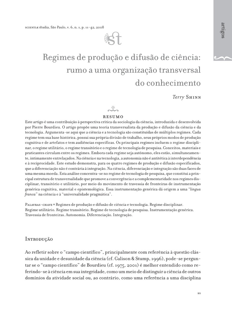 Este artigo uma contribuio perspectiva crtica da sociologia da cincia, introduzida e desenvolvida por Pierre Bourdieu. O artigo prope uma teoria transversalista da produo e difuso da cincia e da tecnologia. Argumenta-se aqui que a cincia e a tecnologia so constitudas de mltiplos regimes. Cada regime tem sua base histrica, possui sua prpria diviso de trabalho, seus prprios modos de produo cognitiva e de artefatos e tem audincias especficas. Os principais regimes incluem o regime disciplinar, o regime utilitrio, o regime transitrio e o regime de tecnologia de pesquisa. Conceitos, materiais e praticantes circulam entre os regimes. Embora cada regime seja autnomo, eles esto, simultaneamente, intimamente entrelaados. Na cincia e na tecnologia, a autonomia no antittica interdependncia e reciprocidade. Este estudo demonstra, para os quatro regimes de produo e difuso especificados, que a diferenciao no contrria integrao. Na cincia, diferenciao e integrao so duas faces de uma mesma moeda. Esta anlise concentra-se no regime de tecnologia de pesquisa, que constitui a principal estrutura de transversalidade que promove a convergncia e a complementaridade nos regimes disciplinar, transitrio e utilitrio, por meio do movimento de travessia de fronteiras de instrumentao genrica cognitiva, material e epistemolgica. Essa instrumentao genrica d origem a uma lingua franca na cincia e universalidade pragmtica. Palavras-chave Regimes de produo e difuso de cincia e tecnologia. Regime disciplinar. Regime utilitrio. Regime transitrio. Regime de tecnologia de pesquisa. Instrumentao genrica. Travessia de fronteiras. Autonomia. Diferenciao. Integrao.