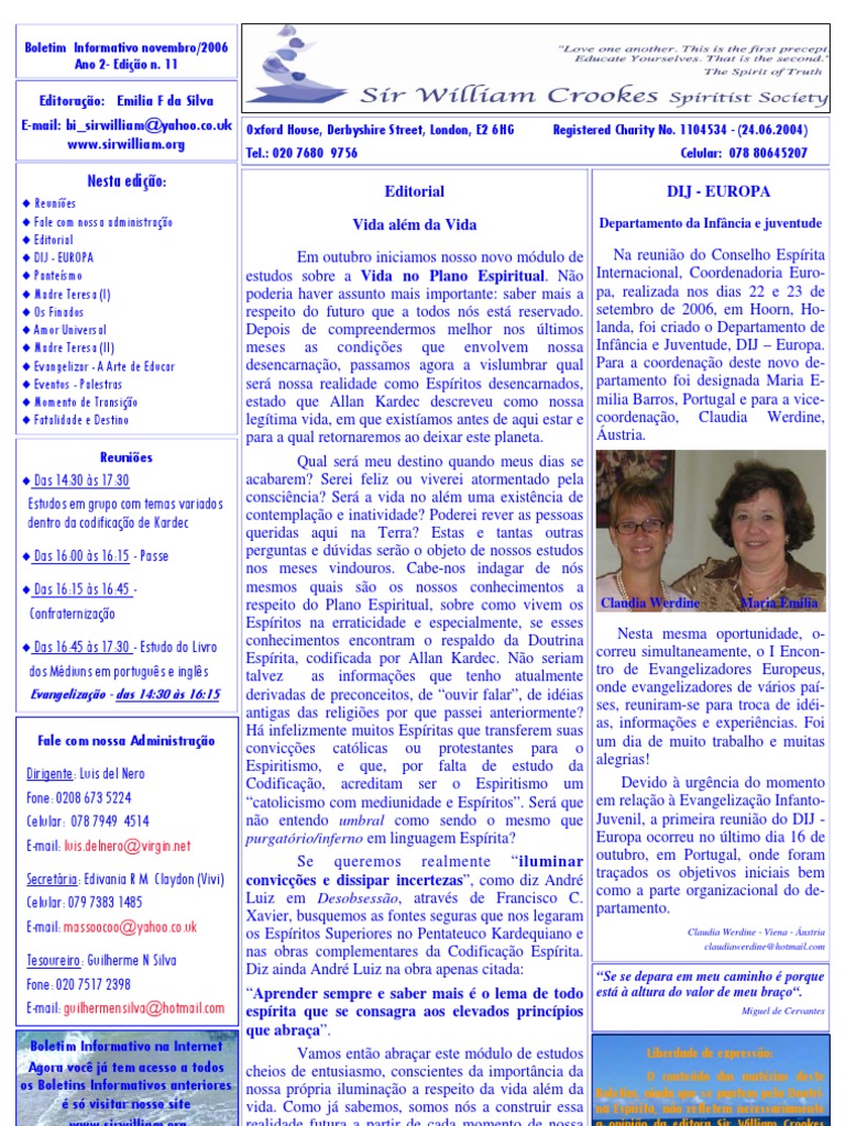 Boletim Informativo novembro/2006 SIR WILLIAM CROOKES SPIRITIST SOCIETY pág. 2