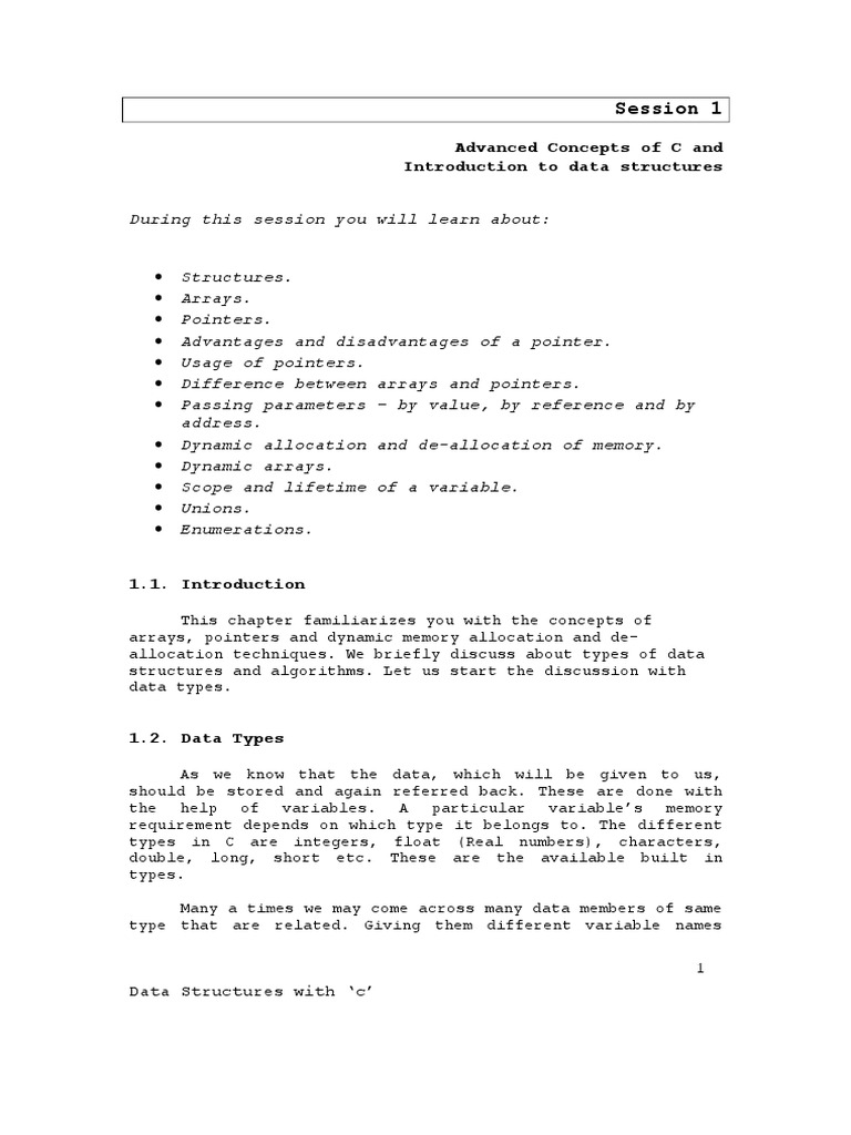 Advanced Concepts of C and Introduction to data structures During this session you will learn about: Structures. Arrays. Pointers. Advantages and disadvantages of a pointer. Usage of pointers. Difference between arrays and pointers. Passing parameters by value, by reference and by address. Dynamic allocation and de allocation of memory. Dynamic arrays. Scope and lifetime of a variable. Unions. !numerations.