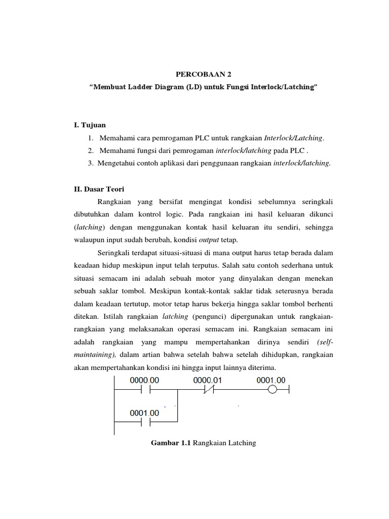 I. Tujuan 1. Memahami cara pemrogaman PLC untuk rangkaian Interlock/Latching. 2. Memahami fungsi dari pemrogaman interlock/latching pada PLC . 3. Mengetahui contoh aplikasi dari penggunaan rangkaian interlock/latching.