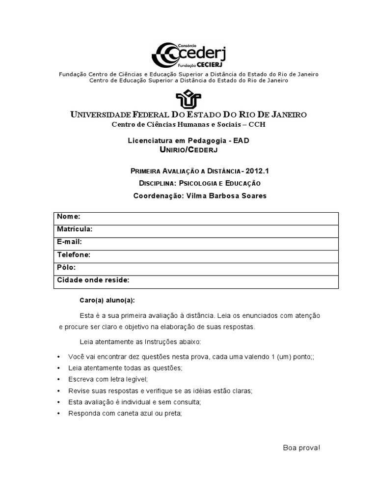 PRIMEIRA AVALIAO A DISTNCIA- 2012.1 DISCIPLINA: PSICOLOGIA E EDUCAO Coordenao: Vilma Barbosa Soares Nome: Matrcula: E-mail: Telefone: Plo: Cidade onde reside: