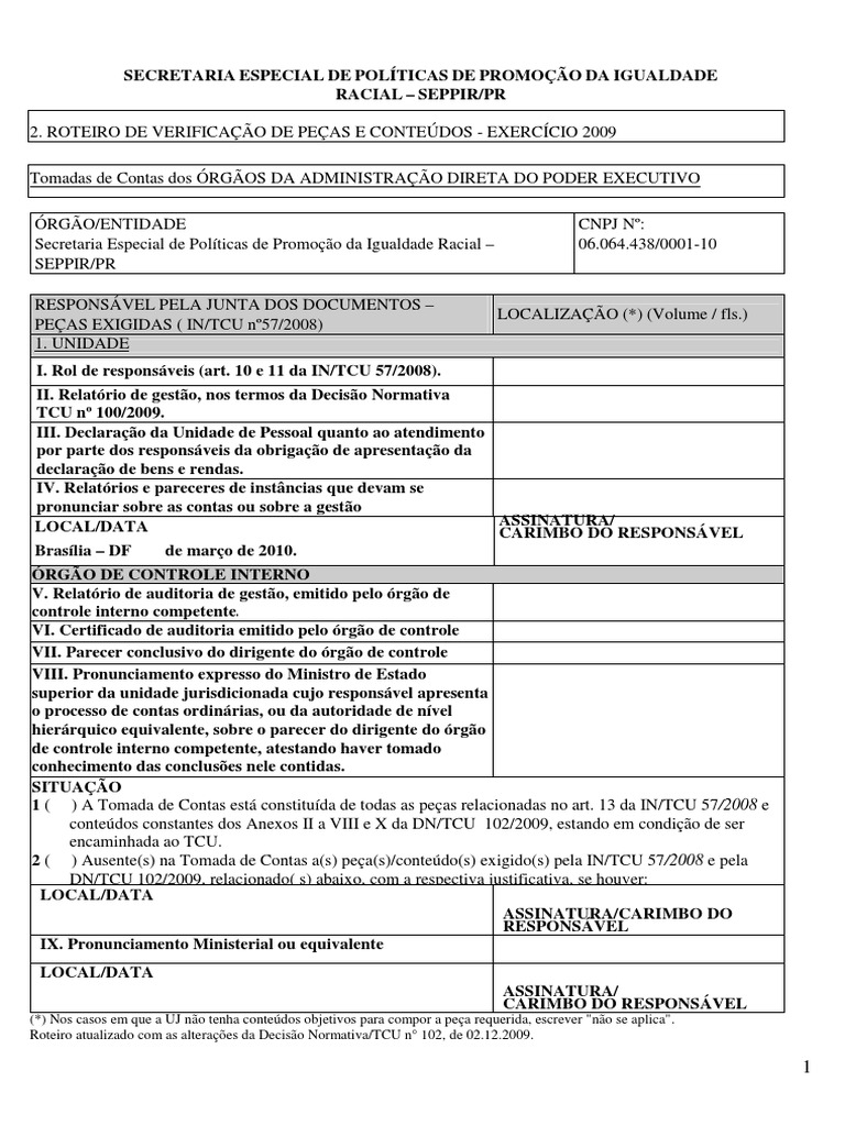 . ROTEIRO DE VERIFICAO DE PEAS E CONTEDOS - EXERCCIO 2009 Tomadas de Contas dos RGOS DA ADMINISTRAO DIRETA DO PODER EXECUTIVO RGO/ENTIDADE Secretaria Especial de Polticas de Promoo da Igualdade Racial SEPPIR/PR RESPONSVEL PELA JUNTA DOS DOCUMENTOS PEAS EXIGIDAS ( IN/TCU n57/2008) 1. UNIDADE CNPJ N: 06.064.438/0001-10