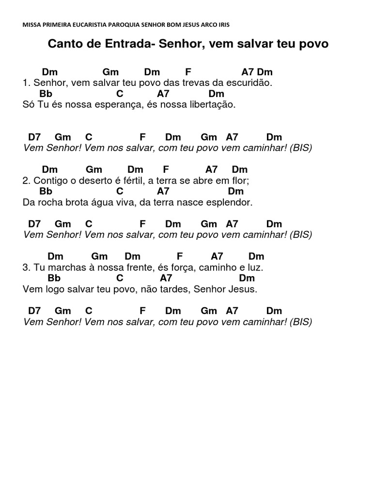 D7 Gm C F Dm Gm A7 Dm Vem Senhor! Vem nos salvar, com teu povo vem caminhar! (BIS) Dm Gm Dm F A7 Dm 2. Contigo o deserto frtil, a terra se abre em flor; Bb C A7 Dm Da rocha brota gua viva, da terra nasce esplendor. D7 Gm C F Dm Gm A7 Dm Vem Senhor! Vem nos salvar, com teu povo vem caminhar! (BIS) Dm Gm Dm F A7 Dm 3. Tu marchas nossa frente, s fora, caminho e luz. Bb C A7 Dm Vem logo salvar teu povo, no tardes, Senhor Jesus. D7 Gm C F Dm Gm A7 Dm Vem Senhor! Vem nos salvar, com teu povo vem caminhar! (BIS)