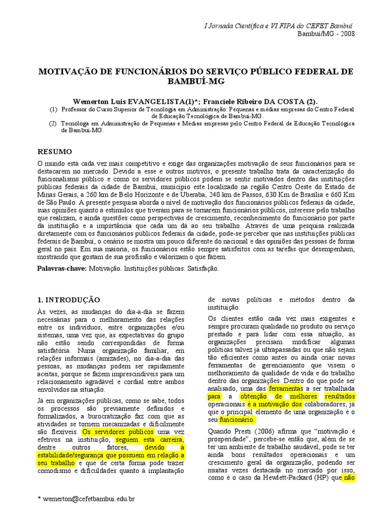 Palavras-chave: Motivação. Instituições públicas. Satisfação.