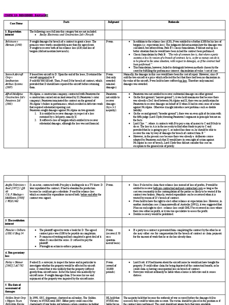 K.B.528. 8.Causation SouthAustralia AssetManagement CorpvMontague Ltd[1997]AC191 9.Mitigation British Westinghouse Electricand ManufacturingCo LtdvUnderground ElectricRailways CoofLondonLtd [1912]AC673 D,avaluer,negligentlyadvisedP,hisclientbank,thatproperty whichitproposedtotakeassecurityforaloanwasworthmuch morethanitsactualmarketvalue.Psuednotonlyforlosses attributabletothedeficientsecuritybutalsoforfurtherlosses attributabletoafallinthepropertymarket. DsuppliedPwithturbineswhichweredeficient.Pacceptedand usedtheturbinesbutreservedtheirrighttoclaimdamages.LaterP replacedtheturbineswithotherswhichweremoreefficientthan thosesuppliedbythedefendantswouldhavebeen,evenifthey hadcompliedwiththecontract.Theplaintiffsclaimedtorecover thecostofthesubstituteturbinesasdamages. Dwon Dwasliableonlyforlossesrelatedtothedeficientsecurity.Thevaluerwasnotliablefor anylosssufferedbythelenderasaresultofafallinthemarket,sincesuchalosswasnota foreseeableconsequenceofthevaluer'snegligenceinprovidinginaccurateinformation.The valuersliabilitywasexcludedonthegroundthatitwasoutsidethescopeoftheliability whichthepartieswouldreasonablyhaveconsideredthatthevaluerwasundertaking. AnylosssustainedbyPhadtobebalancedagainstanygaintothemarisingdirectlyoutof thestepstheyhadtakentolessentheconsequencesofthebreach.AlthoughPhadnot beenboundtobuythenewmachines,havingdonesotheconsequentialgaininprofitsand savedexpenseshadtobebroughtintoaccount.Thesavingsexceededthecostofthe machinesandsoPcouldrecovernothing. Thefamousprincipleofmeasuringdamageswassetinthiscase:Thefirstisthat,asfaras possible,hewhohasprovedabreachofabargaintosupplywhathecontractedtogetisto beplaced,asfarasmoneycandoit,inasgoodasituationasifthecontracthadbeen performed.Thefundamentalbasisisthuscompensationforpecuniarylossnaturallyflowing fromthebreachbutthisfirstprincipleisqualifiedbyasecond,whichimposesona plaintiffthedutyoftakingallREASONABLEstepstomitigatethelossconsequentonthe breach,anddebarshimfromclaiminginrespectofanypartofthedamagewhichisdueto hisneglecttotakesuchsteps. Phaddisposedofthevanbyofferingitforsaletocardealersincludedinitsownlistof thosewithwhomitdidbusinessandnoothers.Phadnotexploredthepossibilityofcar auctionsorofadvertisement.Phadthereforenottakensufficientstepstomitigateitsloss. ThecourtadoptedtheformulathatappliedbytheCommissionerofInlandRevenueto calculatedepreciationplusafurther20%deductiontotakeaccountofthefactofaforced sale.Thedifferencebetweenthesumcalculatedandthesumactuallyobtainedwouldbe deductedfromPsclaim(forPdidnottakesufficientstepstomitigateitsloss)andPwould bepermittedtorecoverthesumremainingoutstandingafterthatdeduction. Ifthepartyisplacedinadifficultsitautionbyreasonofthebreachofadutyowedtohim,as longasheactedreasonablyintheadoptionofremedialmeasures,hewillnotbeheld disentitledtorecoverthecostofsuchmeasuresmerelybecausethebreachingpartycan suggestanothermeasurethatwouldbelessburdensometohim.