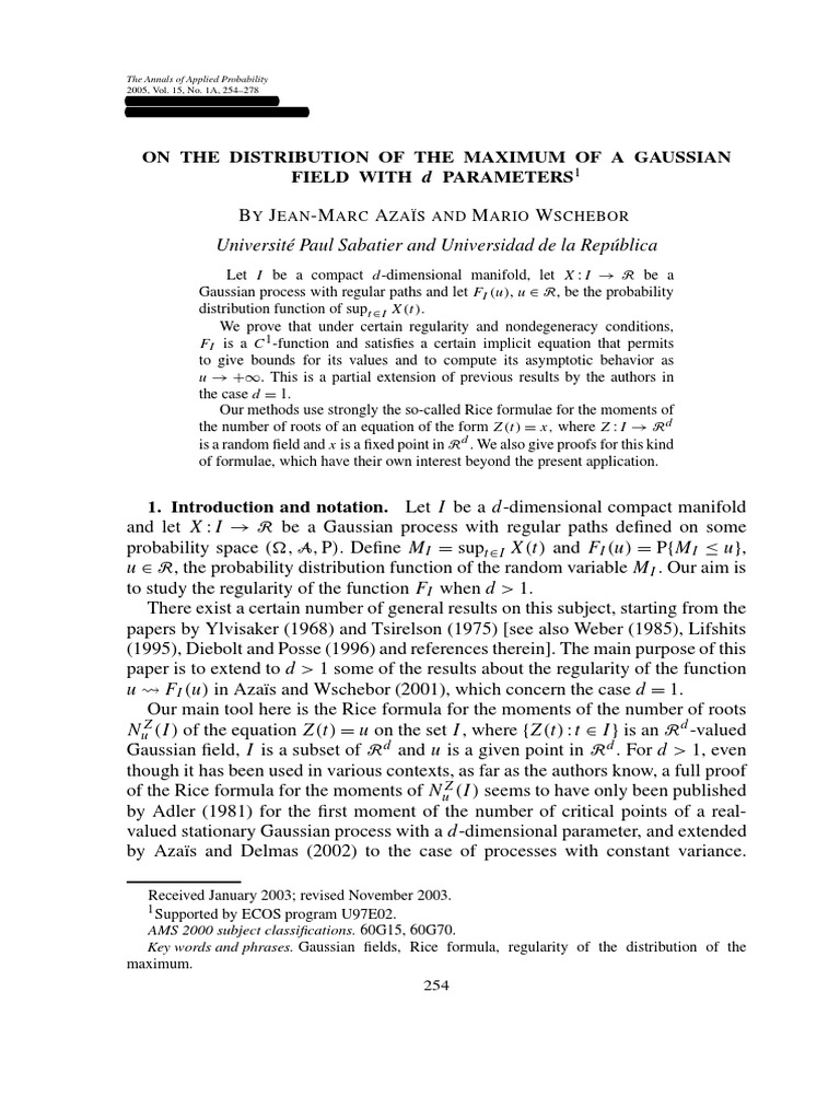 1. Introduction and notation. Let I be a d-dimensional compact manifold and let X : I → R be a Gaussian process with regular paths defined on some probability space ( , A, P). Define M I = sup t∈I X(t) and F I (u) = P{M I ≤ u}, u ∈ R, the probability distribution function of the random variable M I . Our aim is to study the regularity of the function F I when d > 1. There exist a certain number of general results on this subject, starting from the papers by Ylvisaker (1968) and Tsirelson (1975) [see also Weber (1985), Lifshits (1995), Diebolt and Posse (1996) and references therein]. The main purpose of this paper is to extend to d > 1 some of the results about the regularity of the function u F I (u) in Azaïs and Wschebor (2001), which concern the case d = 1. Our main tool here is the Rice formula for the moments of the number of roots