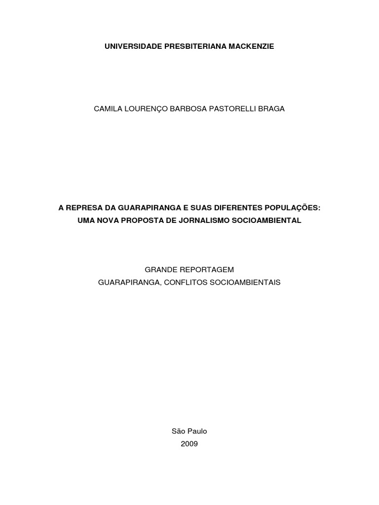 O trabalho propõe uma forma de jornalismo ambiental, intitulada de jornalismo socioambiental. Para isso, utiliza como objeto de estudo a represa da Guarapiranga, localizada na região sul de São Paulo, e a população que ali vive, com as diferentes realidades de cada um. Em um primeiro momento, realizou-se uma análise de mídia, no qual foi observado e analisado de que forma a região é tratada pelos veículos jornalísticos Folha de S. Paulo e O Estado de S. Paulo. Após a percepção de um uso em excesso de fontes oficiais em detrimento das fontes comuns, e também do pouco aprofundamento das histórias de tais fontes e do meio em que vive, produziu-se uma grande reportagem sobre a Guarapiranga, na qual os conceitos propostos inicialmente foram – ou pelo menos tentaram ser – colocados em prática.