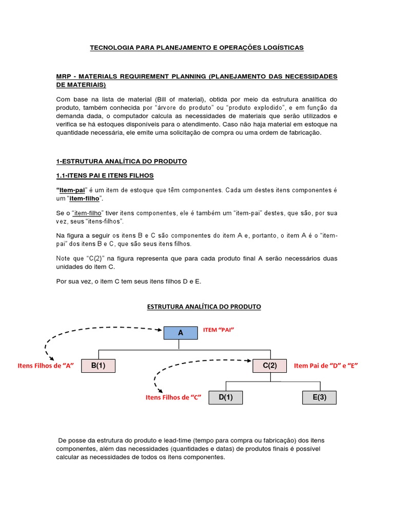 1-ESTRUTURA ANALTICA DO PRODUTO 1.1-ITENS PAI E ITENS FILHOS Item-pai um item de estoque que tm componentes. Cada um destes itens componentes um item-filho. Se o item-filho tiver itens componentes, ele tambm um item-pai destes, que so, por sua vez, seus itens-filhos. Na figura a seguir os itens B e C so componentes do item A e, portanto, o item A o item- pai dos itens B e C, que so seus itens filhos. Note que C(2) na figura representa que para cada produto final A sero necessrios duas unidades do item C. Por sua vez, o item C tem seus itens filhos D e E.
