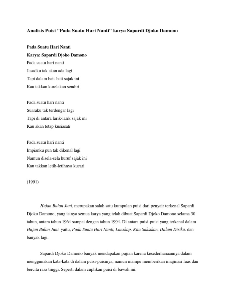Sapardi Djoko Damono dalam puisinya Pada Suatu Hari Nanti mengungkapkan