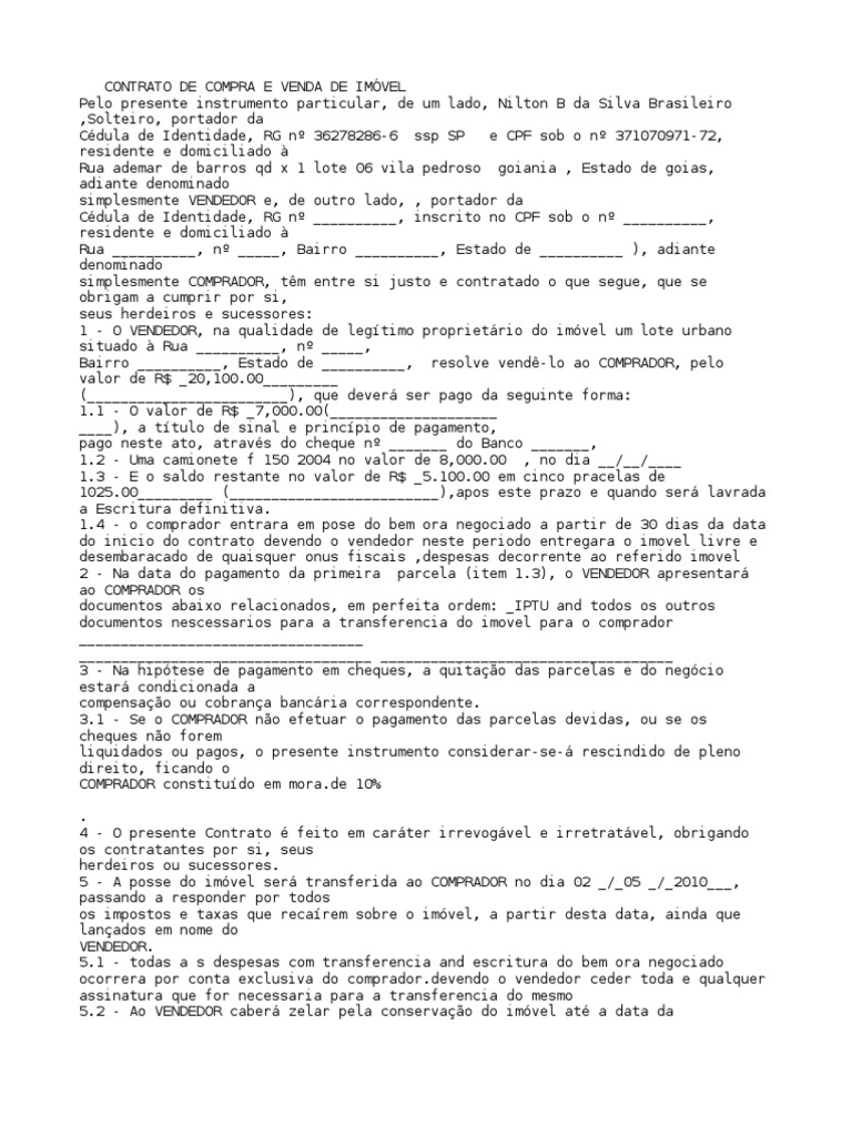 Bairro __________, Estado de __________, resolve vendê-lo ao COMPRADOR, pelo