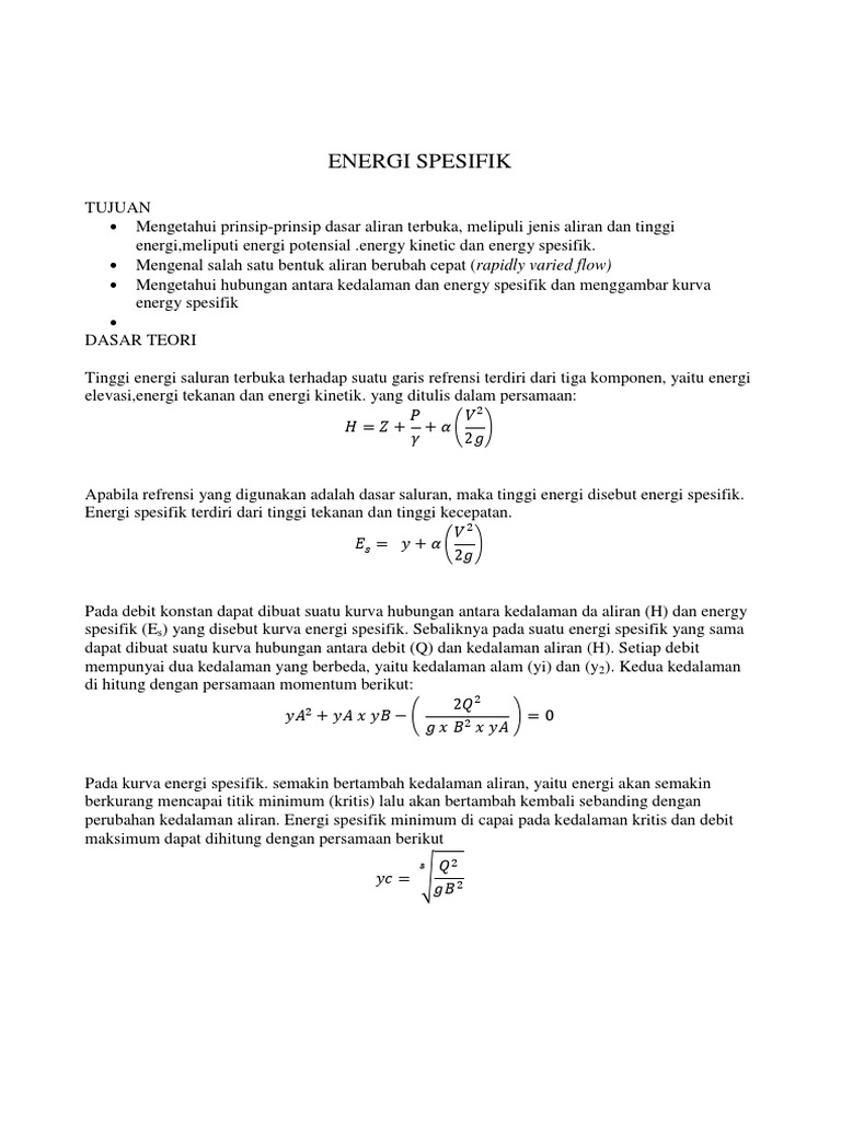 Kurva energi spesifik terdiri dari 3 komponen energi, yaitu: energi spesifik. energi potensial,
