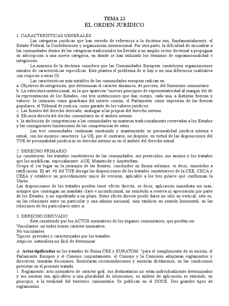 La CE 1978 prolonga y profundiza la visión de la constitución republicana de 1931. 5. La vigente constitución ha colocado en un marco relativamente amplio las relaciones entre el orden jurídico intnal y el español. RELACIÓN ENTRE DERECHO COMUNITARIO Y DERECHO INTERNACIONAL Reuter: "la cuestión que se plantea es la de si las relaciones entre el drcho comunitario y el drcho intnal público están regidas por soluciones monistas o dualistas": problema complejo no ha sido resuelto. el ordenamiento español se hace eco del art. reconoce la subordinación del drcho comunitario al di que vincula a la comunidad: *no están claros los criterios determinantes de la eficacia concreta de una norma jurídica intnal en el ámbito comunitario. tanto por su monopolio de la interpretación auténtica del drcho comunitario como por haber utilizado preferentemente métodos de interpretación finalista. la cual se basaba en: a. Tiene gran trascendencia en el ordenamiento jurídico comunitario. el Tj. sin embargo. así la única vez que se ha llevado a cabo una reforma constitucional fue porque tras el tratado de Maastricht los extranjero tendría drcho a votar en España . pq este tiene carácter gral) . Actos atípicos de órganos comunitarios No corresponden a las categorías establecidas por los Tratados. 96 y 93 actualmente). *idem. Resoluciones: constituye una declaración de intención desprovista de efectos obligatorios. "las normas generales del DIP son parte integrante del dercho federal. Las comunidades están sometidas al drcho intal gral. reconocer. Sobre la base de la jurisprudencia del TJ de las comunidades caben algunas observaciones: a. Decisión: será obligatoria en todos sus elementos para todos sus destinatarios (diferenta a reglamento. Directiva: obligará al Estado/s miembro/s destinatario/s en cuanto al resultado que deba conseguirse. reconocimiento de las reglas grals del DI como normas de drcho español b.2.a particulares: no carácter normativo . LA RECEPCIÓN DEL DERECHO COMUNITARIO EN EL DERECHO ESPAÑOL. decisiones: del consejo: las que han institucionalizado los procedimientos de coordinación de las políticas económicas nacionales. 3. B. congruencia y armonía entre di y legislación española (art. prevalecen sobre ellas y establecen drcho y obligaciones directas para los nacionales.a estados: fuente de derecho comunitario: no siempre carácter normativo. c. sino también por aquellos convenios multilaterales anteriores a la existencia de las comunidades que obliguen a los Estados miembros y que se refieran a materias que hayan sido objeto de una transferencia de competencias de los Estados a las comunidades. El drcho comunitario aparece insertado en un orden jurídico intnal más vasto cuya primacía debe. pero sí conllevan efectos jurídicos. pues la actividad del TJ ha generado una verdadera "legislación jurisprudencial". Recomendaciones y dictámenes: actos no vinculantes. a su vez. Ni los Estados miembros ni los órganos comunitarios no judiciales tienen competencia para decidir obligatoriamente en caso de controversia cómo ha de interpretarse del drcho establecido por ellos. 2. Su naturaleza no viene determinada por su denominación. 1. 25 de la Ley fundamental de Bonn. 4 LA JURISPRUDENCIA DEL TRIBUNAL DE JUSTICIA. a las autoridades nacionales la elección de la forma y los medios. 6. apertura del drcho español hacia las OI Siguiendo una posición monista con primacía del di. Las comunidades no sólo están vinculadas por los convenios concluidos por ellas. b. Así en caso de contradicción entre norma interna e internacional prevalecerá la norma intnal. 4. c. sino por su contenido real.