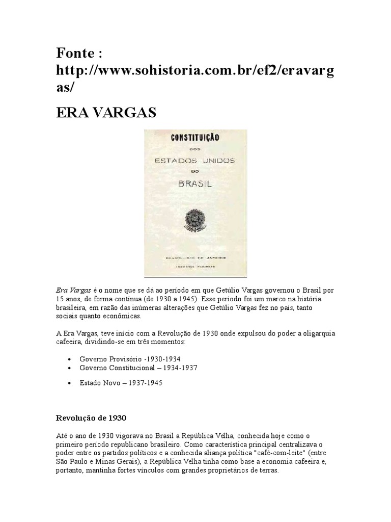 A Era Vargas, teve incio com a Revoluo de 1930 onde expulsou do poder a oligarquia