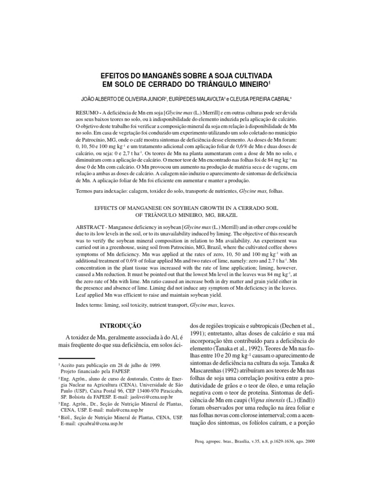 Termos para indexao: calagem, toxidez do solo, transporte de nutrientes, Glycine max, folhas.