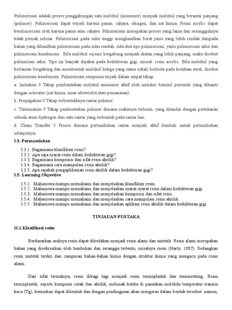 (polimer). Polimerisasi dapat terjadi karena panas, cahaya, oksigen, dan zat kimia. Resin acrylic dapat
