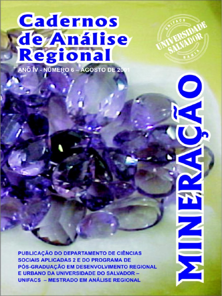 ste sexto número dos Cader- nos de Análise Regional examina o setor mineral do Estado da Bahia, reu- nindo a contribuição dos professores João Batista Guimarães Teixeira e Adalberto de F. Ribeiro. O primeiro, re- presentando a Universidade e o segun- do, a Coordenação de Mineração da Secretaria de Indústria, Comércio e Mi- neração do Estado da Bahia. Compa- rece também ao debate o empresário Paulo Henrique Leitão Lopes, Presiden- te da Progemas, um ardente defensor do potencial econômico do setor, nota- damente na área das gemas e pedras preciosas. Nesta edição, apresentam-se tam- bém os slides das palestras, que foram gentilmente cedidos pelos expositores. O caderno reproduz integralmente os textos apresentados, assim como as respostas às questões formuladas pe- los participantes. Este painel, que faz parte de um conjunto de quinze sobre os mais di- versos aspectos da economia regional, é uma produção conjunta do Programa de Pós-Graduação em Desenvolvimen- to Regional e Urbano, Mestrado em Análise Regional, e do Instituto de Pes- quisas Aplicadas da UNIFACS, com o