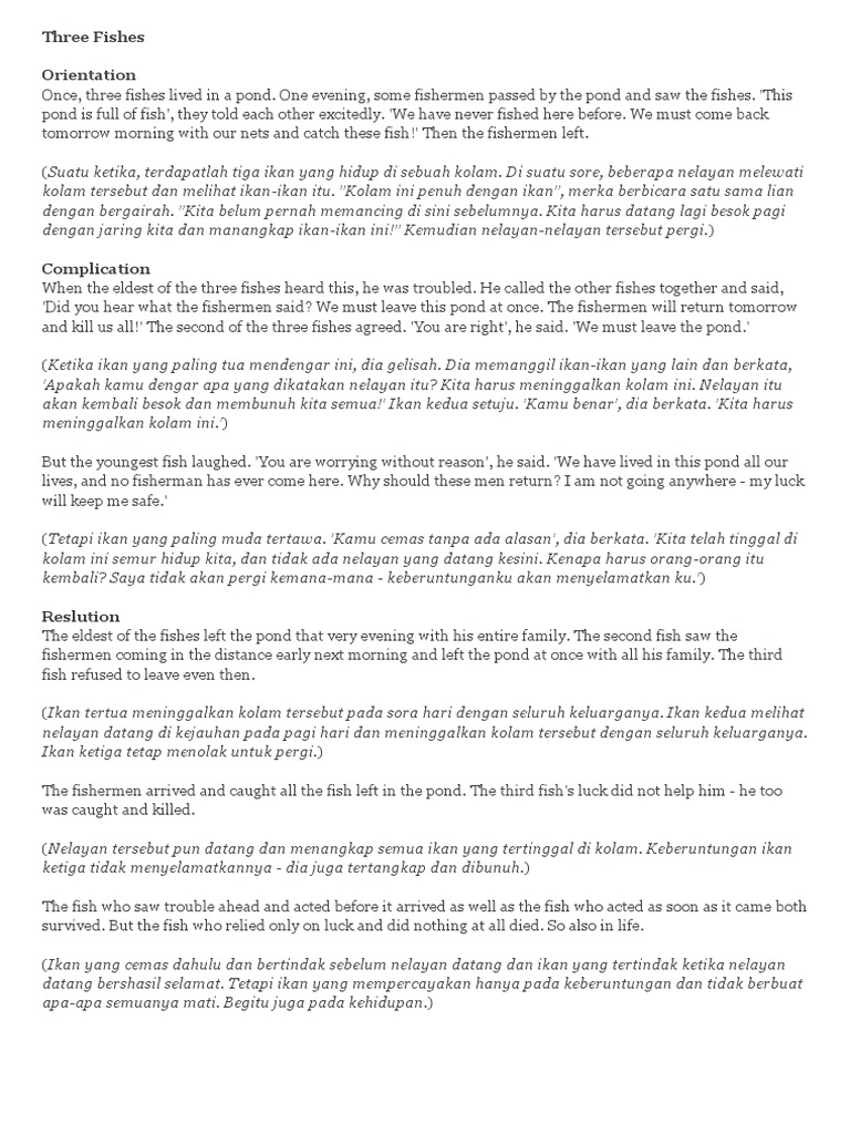 (Suatu ketika, terdapatlah tiga ikan yang hidup di sebuah kolam. Di suatu sore, beberapa nelayan melewati