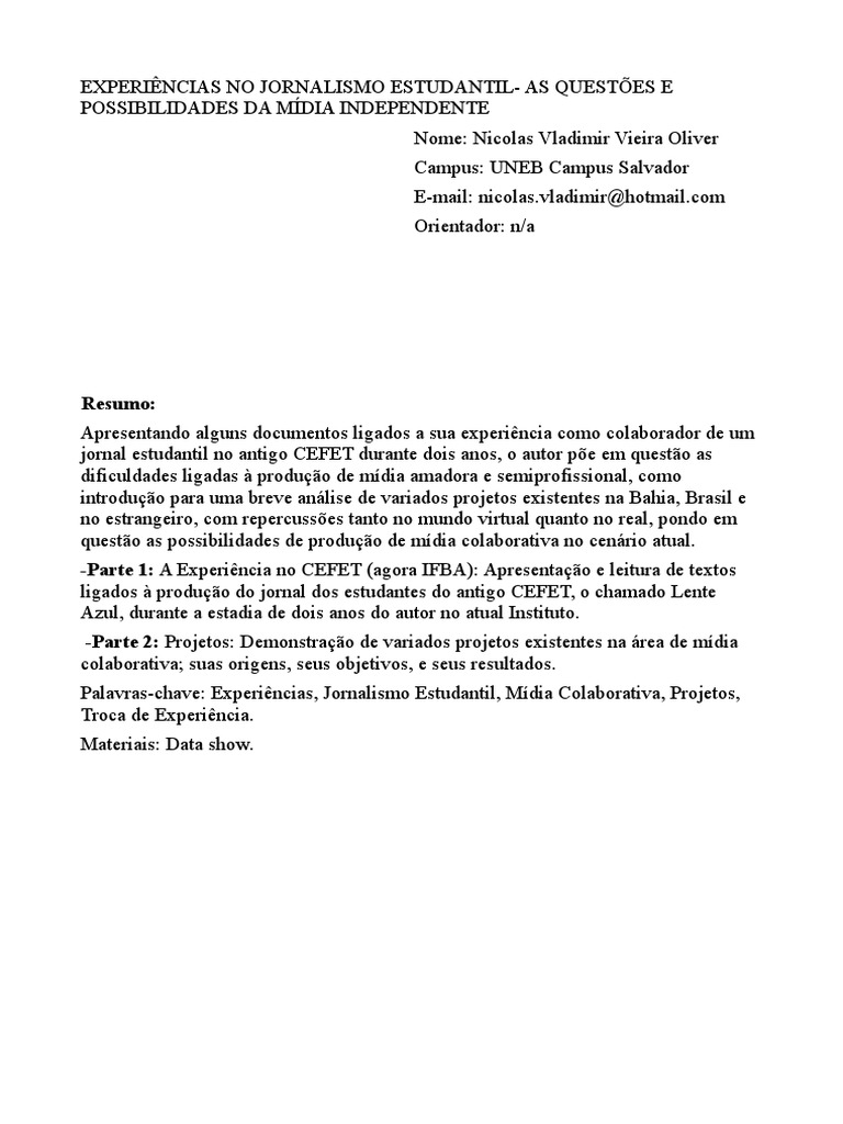 Palavras-chave: Experincias, Jornalismo Estudantil, Mdia Colaborativa, Projetos,