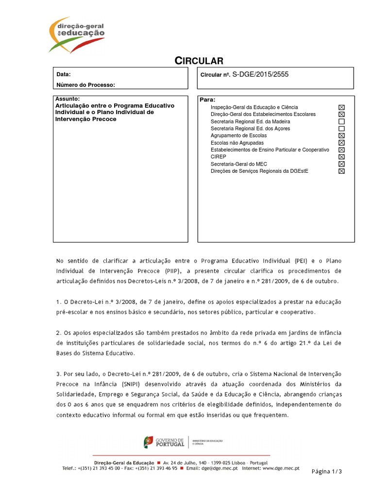 Individual de Intervenção Precoce (PIIP), a presente circular clarifica os procedimentos de