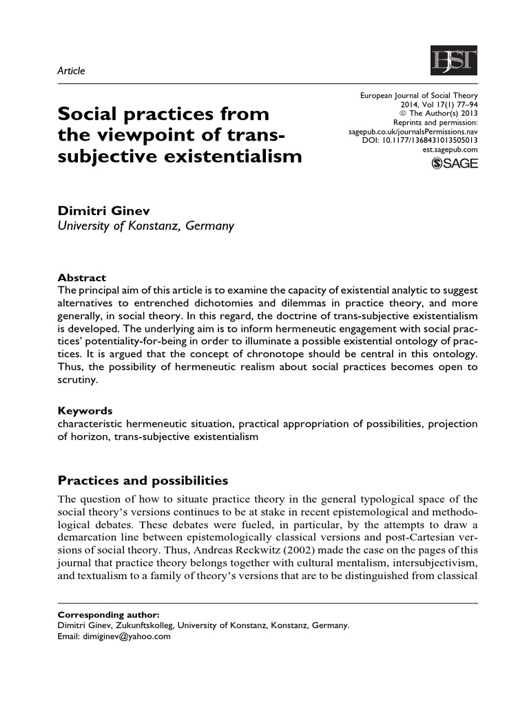 of the horizon of possibilities and the hermeneutic fore-structure of a domain’s articula- tion occupy in my approach to practices a place similar to that of habitus in the socio- logical theory of practice. Theorizing practices from a radically anti-essentialist standpoint leads not to pragma- tism, instrumentalism, or conventionalism, but to a position that I should like to dub trans-subjective existentialism . The underlying formula of the latter can be expressed as eschewing the reification of holistic social entities and the hypostatization of social structures, while combating any kind of reductionist naturalism. At stake in this kind of existentialism are (individual or collective) choices of possibilities within a trans- subjective horizon of possibilities projected by an interrelatedness of practices. The horizon always already transcends that subjectivity (i.e. subjective mentality, cognitive attitudes, volitional dispositions, narratively organized memory, emotionality, etc.) which is liable to choices that are made or can be made. Trans-subjectivity connotes the transcendence of subjectivity which accompanies the individual choices within the collective appropriation of possibilities. 4 ‘Trans-subjective existentialism’ sounds like an oxymoron. To be sure, practice the- ory involves concepts that ‘sublate’ the concepts of the individual agent and individual choices. Practice theory is about a reality in which individual choices are ‘secondary’ and ‘derivable’. But this theory is not about something that determines these choices. Practice theory stresses that the choosing individuals are agents in a state of situated transcendence—they are constantly creating their situations by choosing and appropriat- ing possibilities that in their openness and inexhaustibility always transcend each situ- ated choice and appropriation. In laying emphasis on the figure of situated transcendence of agents-within-interrelated-practices, practice theory (tacitly or expli- citly) admits a ‘practical subject’ whose status is akin to the dual status of Heidegger’s Dasein. 5 Accordingly, practice theory reproduces in new conceptual frameworks figures of that existentialism which is peculiar to existential analytic. To sum up, there is no incompatibility (not to speak of contradiction) between prac- tice theory and existentialism since all individual choices (including the decisive choice that marks the transition from inauthentic to authentic existence) take place within prac- tices. Making individual choices within a trans-subjective horizon that transcends the individual subjectivity does not amount to presenting the choosing process as determined by a transcendent essence. Projection and appropriation of possibilities by practices are in a relation of mutual reinforcement on the level of trans-subjectivity. In the upcoming considerations I will develop this thesis in two steps, each of which is related to a par- ticular definition of configured practices. (Let me stress again that from the viewpoint of hermeneutic phenomenology the notion of ‘interrelated practices’ has priority over the notion of ‘practice’.) Definition I : A tendency to projection and appropriation of definite possibilities within a trans-subjective horizon of possibilities is a configuration of practices if the actualization of the appropriated possibilities leads to a temporal-spatial order of doings and sayings. With regard to the clusters of doings and sayings one can post hoc single out within this order, so there can be formulated empirically relevant criteria for distinguish- ing particular practices in the configuration. The underlying assumption is that every cluster represents a relatively autonomous practice.