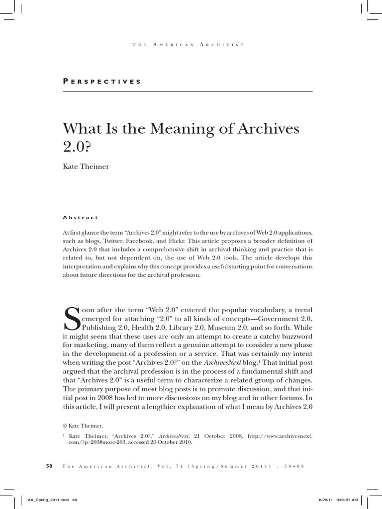 My initial thoughts on Archives 2.0 were influenced by the Library 2.0 phenomenon. 2 Note that although I used Library 2.0 as an inspiration for my conception of Archives 2.0, I associate a broader group of changes with Archives 2.0