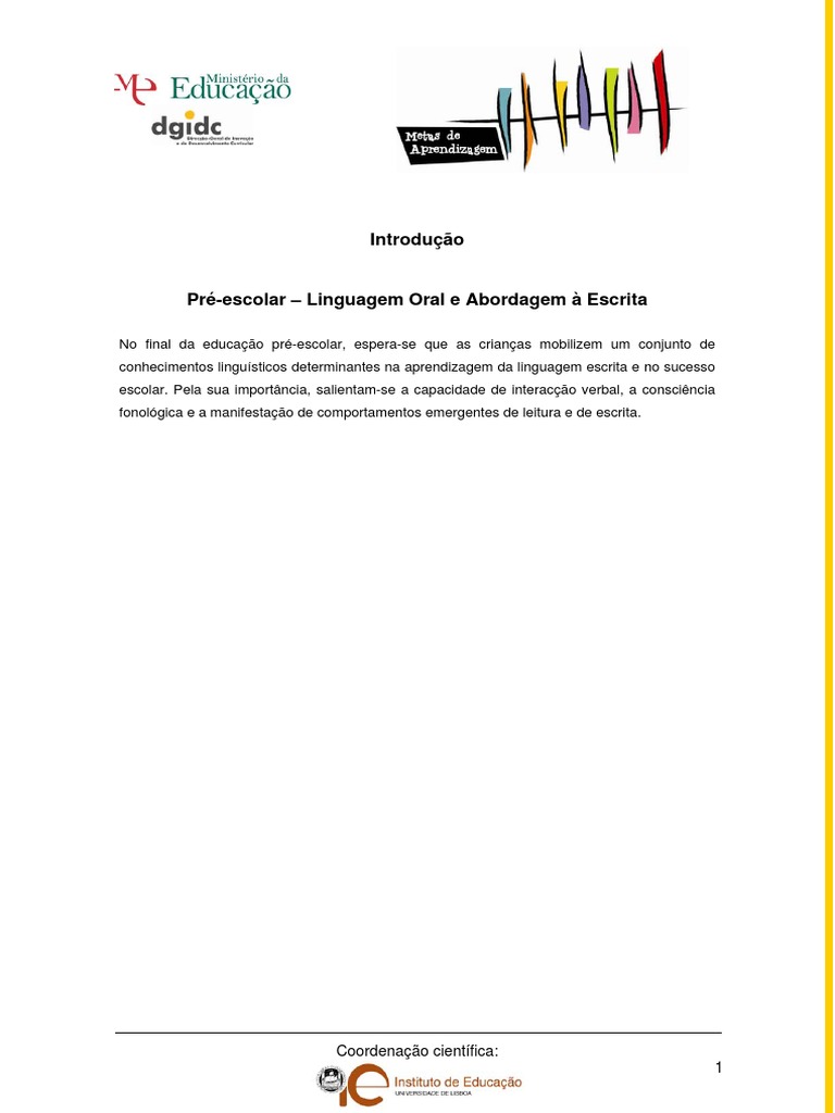 No final da educação pré-escolar, espera-se que as crianças mobilizem um conjunto de conhecimentos linguísticos determinantes na aprendizagem da linguagem escrita e no sucesso escolar. Pela sua importância, salientam-se a capacidade de interacção verbal, a consciência fonológica e a manifestação de comportamentos emergentes de leitura e de escrita.