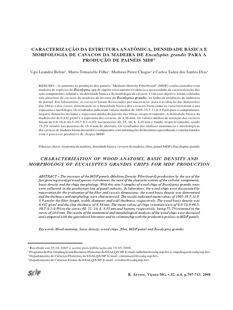Palavras-chave: Anatomia da madeira, densidade básica, cavacos de madeira, fibra, painel MDF e Eucalyptus grandis