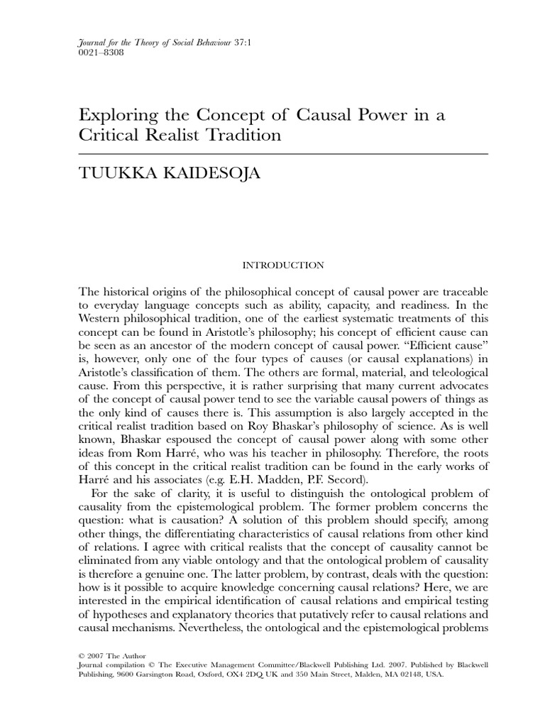 Journal for the Theory of Social Behaviour. Kausaliteetti ja kriittinen realismi. (1991). (2000). Bhaskar (ed. The Sociological Review. J. (1990). López & G. Realism. (1990). S. C. Is There a Fundamental Level? Noüs. 21(2). Population Thinking and Essentialism. Journal for the Theory of Social Behaviour. 26(3). [In Finnish. A Realist Philosophy of Social Science: Explanation and Understanding. Harré and His Critics. Cambridge: Cambridge University Press. J. Cambridge: Cambridge University Press. 350 – 383. 30(3). Massachusetts: The MIT Press. (1992). Cambridge. (2006). S. (1982). Social Constructivism. C. Concepts of “Action”. Conflicting Varieties of Realism: Causal Powers and the Problem of Social Structure. 221– 250. 105–111. 313 – 325. (1980). S. & V. Journal for the Theory of Social Behaviour. V. 249–268. (1999). After Postmodernism: An Introduction to Critical Realism. 49. (2005). Oxford: Basil Blackwell. The Ethogenies of Agency and Structure: A Metaphysical Problem. London and New York: Routledge. Philosophical Studies. 616 – 632. & Y. In R. Rom Harré: Realism and Turn to Social Constructionism. 2007 . R. 498 – 517. Harré and His Critics. 54. (2003). S. K. H. (1996). (2001). (1992). 95. (2006). and Beyond. P. Essentialism. Second Edition. 3 – 36. A. 1–13.). 47. (1997). S. 37(3). Journal for the Theory of Social Behaviour. 32(1). M. J. R. J. London and New York: The Athlone Press. R. In R. S. (2001). In J.Exploring the Concept of Causal Power in a Critical Realist Tradition 87 H. Sosiologia. P.R. 453 – 487. British Journal for the Philosophy of Science. S. R. J. Philosophy of Science. 3(45).). © 2007 The Author Journal compilation © The Executive Management Committee/Blackwell Publishing Ltd. C. Evolution. W. H. P. Oxford: Basil Blackwell. Potter (eds. Causality and the Problem of Social Structure.). K. C. Harré and Madden’s Multifarious Account of Natural Necessity. P. (1997). “Structure” and “Power” in “Critical Social Realism”: A Positive and Reconstructive Critique. 1(43). T. Philosophy of Science. London: Routledge. K. Bhaskar (ed. Rediscovery of the Mind. S. V. L. “Subjects” versus “Persons” in Social Psychological Research. (2002). Economics and Reality. R.] L. 1–15. The Impossibility of which Naturalism? A Response and Reply. Method in Social Science: A Realist Approach. Social Emergence: Societies as Complex Systems. Making sense of Emergence. E. Of Humean Bondage. P. A.