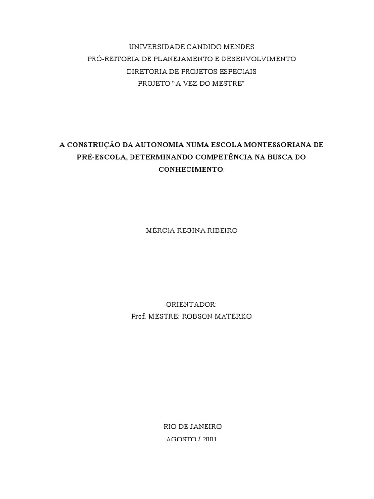 A CONSTRUÇÃO DA AUTONOMIA NUMA ESCOLA MONTESSORIANA DE PRÉ-ESCOLA, DETERMINANDO COMPETÊNCIA NA BUSCA DO CONHECIMENTO.