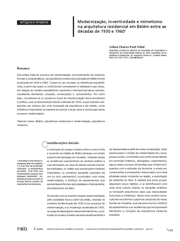 1 Este artigo é uma versão re- visada de partes dos capítulos 3 e 4 da Tese de Doutorado intitulada “La Arquitectura em Belém, 1930-1970: una modernización dispersa com lenguajes cambiantes”, de- fendida em julho de 2005 na Escuela Técnica Superior de Arquitectura de Barcelona.
