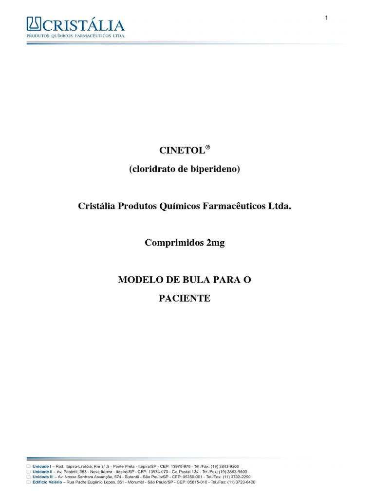 CINETOL (cloridrato de biperideno) destinado ao tratamento da sndrome parkinsoniana, especialmente para controlar