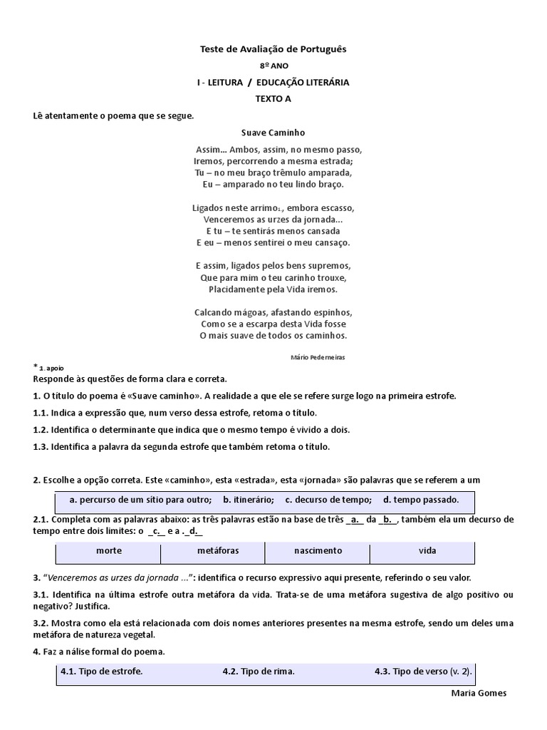 1. O ttulo do poema Suave caminho. A realidade a que ele se refere surge logo na primeira estrofe.