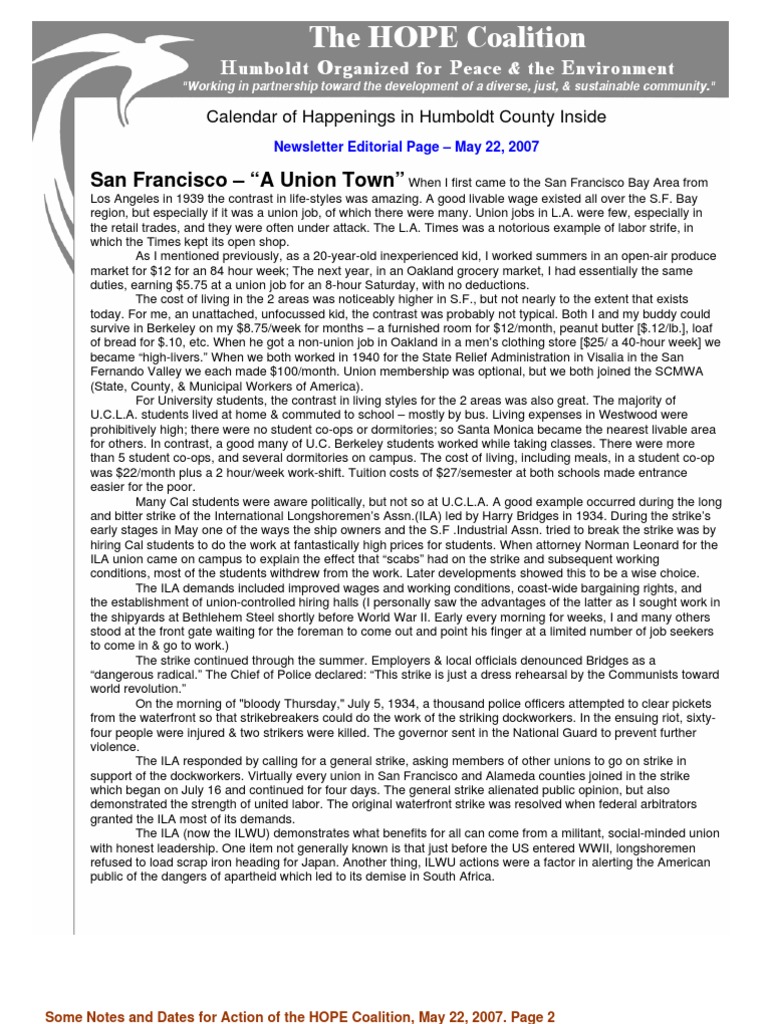 Some Notes and Dates for Action of the HOPE Coalition, May 22, 2007. Page 2