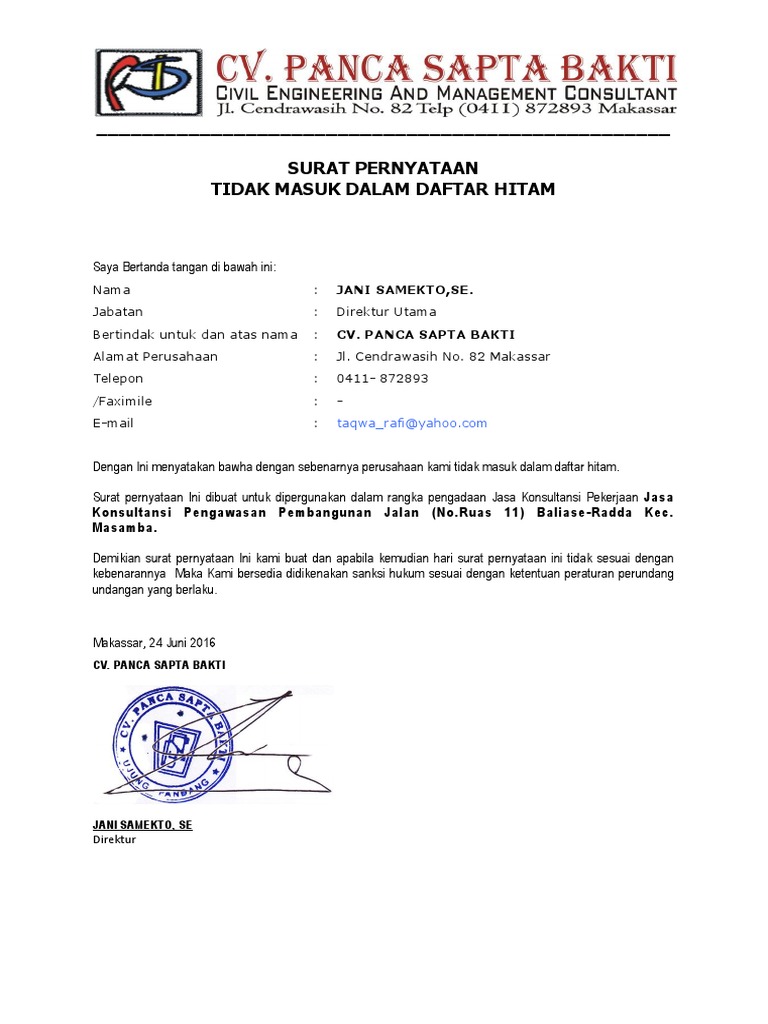 Dengan Ini menyatakan bawha dengan sebenarnya perusahaan kami tidak masuk dalam daftar hitam.