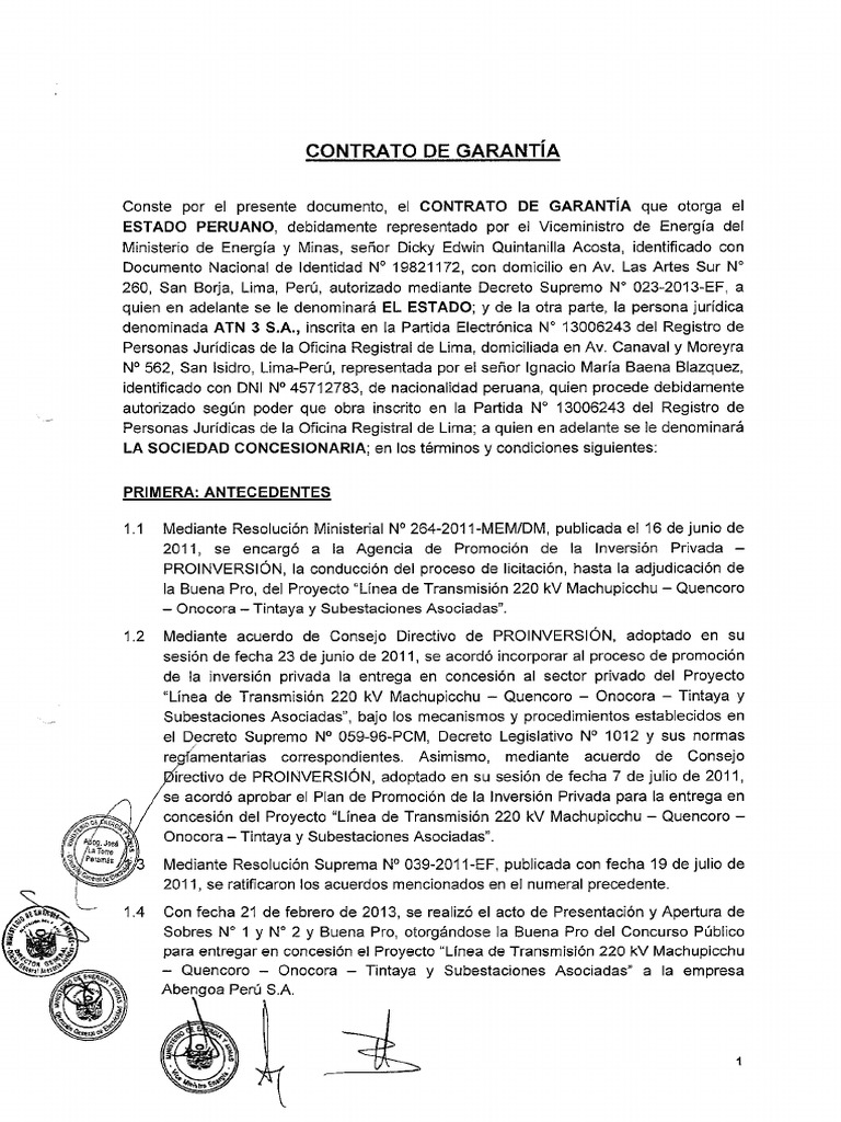 empresa que obtuviera la Buen Pro del Concurso Público para la entrega en concesión del proyecto "Línea de Transmisión 220 kV Machupicchu . 2. Esta garantía no constituye una garantía financiera. . comunicó a PROINVERSIÓN que la denominación de Sociedad Concesionaria constituida es "ATN 3 S. 1. se establece como uno de ios actos del cierre. eí CONTRATO DE CONCESIÓN).8 De conformidad con lo indicado en el numeral precedente y de acuerdo a lo dispuesto en el Artículo 2o del Decreto Ley N0 25570.A.A.Quencoro .Onocora . la suscripción del Contrato de Seguridades y Garantías. seguridades y obligaciones a cargo del Estado Peruano. SEGUNDA: DE LA GARANTÍA 2A En virtud del presente CONTRATO DE GARANTÍA. por el cual se otorga la garantía del Estado de la República del Perú en respaldo de las declaraciones. sustituido por el Artículo 6o de la Ley N0 26438. de las seguridades y garantías del Estado de (a República del Perú. el Poder Ejecutivo dispuso el otorgamiento mediante contrato. Abengoa Perú S.Quencoro .A.2 EL ESTADO reconoce y garantiza que el Comité de PROINVERSIÓN en Proyectos de Energía e Hidrocarburos .Onocora . autorizando al Viceministro de Energía del Ministerio de Energía y Minas. así como a las leyes y demás normas vigentes en ia República del Perú. constituido mediante Resolución Suprema N0 010-2012-EF. las declaraciones. EL ESTADO garantiza a LA SOCiEDAD CONCESIONARIA. a suscribir el presente CONTRATO DE GARANTÍA a nombre de EL ESTADO." 1.Tintaya y Subestaciones Asociadas".5 Mediante acuerdo de Consejo Directivo de PROÍNVERSIÓN adoptado en su sesión del 4 de abril de 2013.Tintaya y Subestaciones Asociadas" (en adelante.1. seguridades y obligaciones del Estado Peruano estipuladas en el Contrato de Concesión del Proyecto: "Línea de Transmisión 220 kV Machupicchu .7 En el numeral 6o del Anexo N0 5 (Procedimiento para el Cierre) de las Bases del concurso. en el Artículo 1357° del Código Civil y en e! Decreto Supremo N0 101-2013-EF.PRO CONECTIVIDAD. establecidas en el CONTRATO DE CONCESIÓN.Onocora - Tintaya y Subestaciones Asociadas". de conformidad y dando cumplimiento a lo establecido en las Bases del concurso.6 Mediante documento de fecha 21 de marzo de 2013. se acordó autorizar el otorgamiento mediante contrato. llevó a cabo el concurso. a celebrarse con ia Sociedad Concesionaria que seria constituida por el Adjudicatario Abengoa Perú S. seguridades y obligaciones del Ministerio de Energía y Minas quien actúa en representación de EL ESTADO. 1. contenidas en el Contrato de Concesión del Proyecto "Línea de Transmisión 220 kV Machupicchu . de las seguridades y garantías contempladas en el presente documento. a favor de LA SOCiEDAD CONCESIONARIA.Quencoro . en respaldo de las declaraciones.