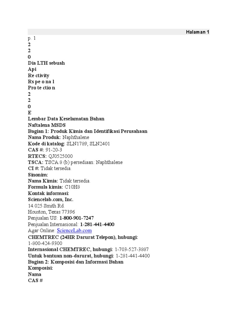 beracun dan melepaskan pelaporan: Naphthalene: 1%