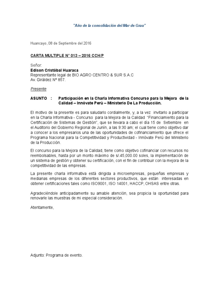 Concurso para la Mejora de la Calidad “Financiamiento para la Certificación de Sistemas de Gestión”.Innóvate Perú del Ministerio de la Producción."Año de la consolidación del Mar de Grau" Huancayo.45. Aymachoque Pilares Representante legal deALPACA D & C COMPANY SAC. la implementación de un sistema de gestión y obtener su certificación. HACCP. La presente charla informativa está dirigida a microempresas. hasta por un monto máximo de s/. Agradeciéndole anticipadamente su amable atención. Presente ASUNTO : Participación en la Charla Informativa Concurso para la Mejora de la Calidad – Innóvate Perú – Ministerio De La Producción. ISO 14001.00 soles. Atentamente. que se llevara a cabo el día 15 de Setiembre en el Auditorio del Gobierno Regional de Junín. tiene como objetivo cofinanciar con recursos no reembolsables. y. que están interesadas en obtener certificaciones tales como ISO9001. a la vez invitarlo a participar en la Charla Informativa . sea propicia la oportunidad para renovarle las muestras de mi especial consideración. Libertad Nº 1133. El motivo de la presente es para saludarlo cordialmente. OHSAS entre otras. pequeñas empresas y medianas empresas de los diferentes sectores productivos. con el fin de contribuir con la mejora de la competitividad de las empresas. Adjunto: Programa de evento. . El concurso para la Mejora de la Calidad. 08 de Septiembre del 2016 CARTA MULTIPLE N° 013 – 2016 CCH/P Señor: Nelly. a las 9:30 am. el cual tiene como objetivo dar a conocer a los empresarios una de las oportunidades de cofinanciamiento que ofrece el Programa Nacional para la Competitividad y Productividad .000. Jr.