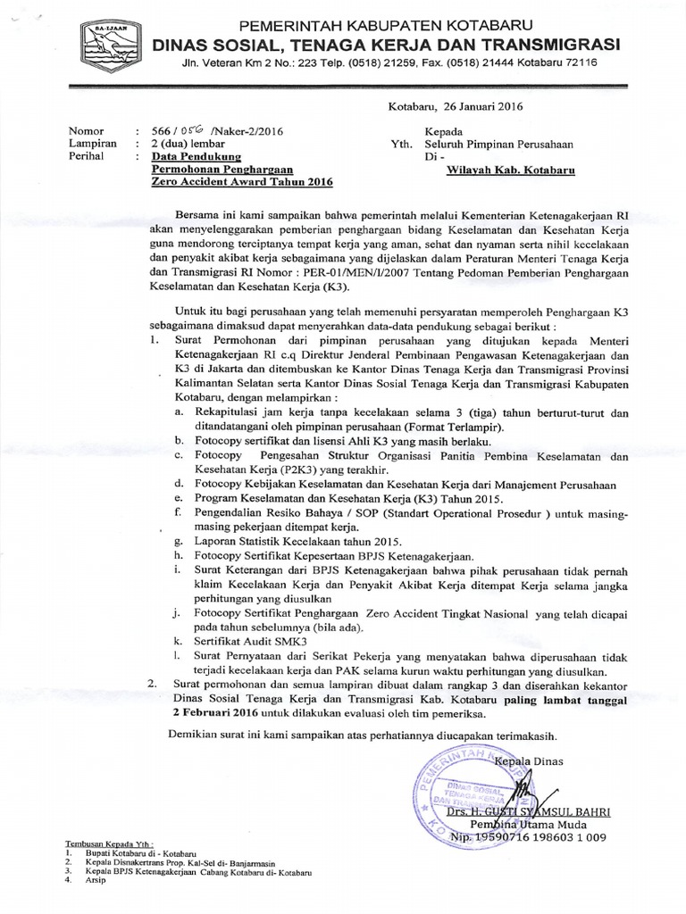 Dinas Sosial Tenaga Kerja dan Transmigrasi Kab. Kotabaru paling lambat tanggal
