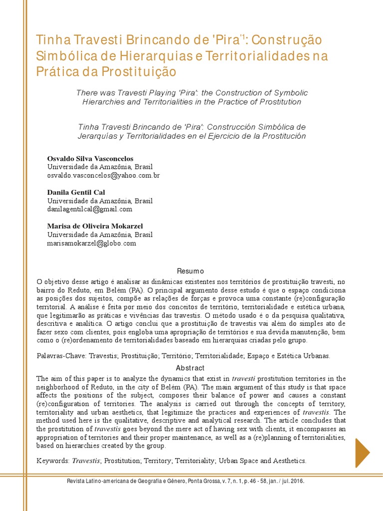 Keywords: Travestis Prostitution Territory Territoriality Urban Space and Aesthetics.