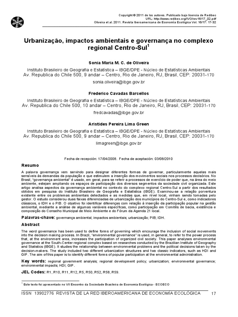 Palavras-chave: governana ambiental; impactos ambientais; urbanizao; PIB; IDH.