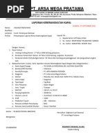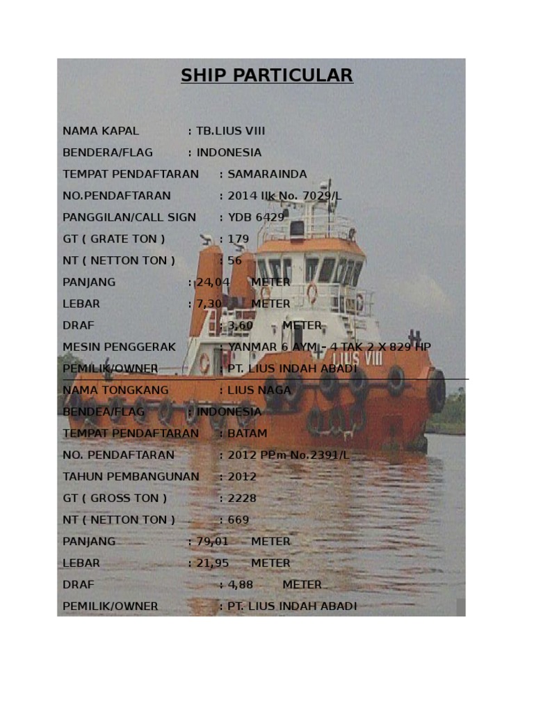 Dokumen ini memberikan informasi tentang kapal TB. Lius VIII milik PT. Lius Indah Abadi yang terdaftar di Samarinda dengan panjang 24,04 m, lebar 7,30 m, dan draft 3,60 m. Juga memberikan informasi tentang tongkang Lius Naga milik yang sama dengan panjang 79,01 m, lebar 21,95 m, dan draft 4,88 m.