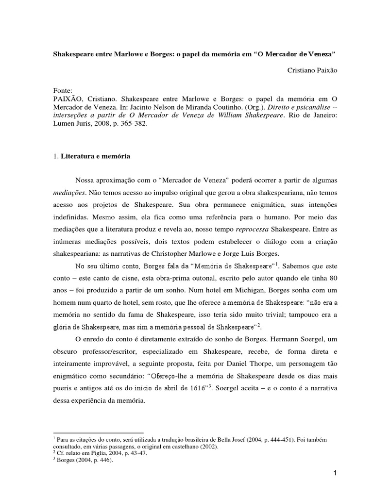 PAIXO, Cristiano. Shakespeare entre Marlowe e Borges: o papel da memria em O