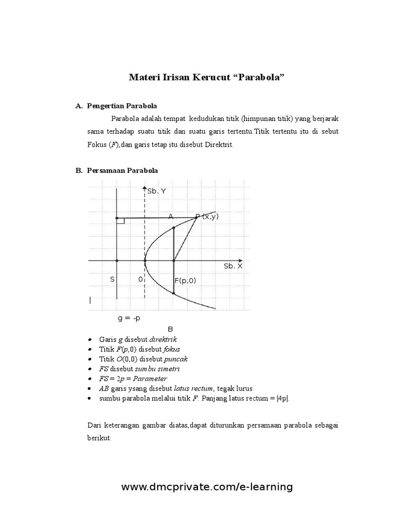 Parabola adalah tempat kedudukan titik (himpunan titik) yang berjarak