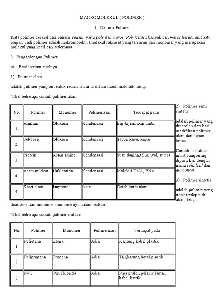 bagian. Jadi polimer adalah makromolekul (molekul raksasa) yang tersusun dari monomer yang merupakan